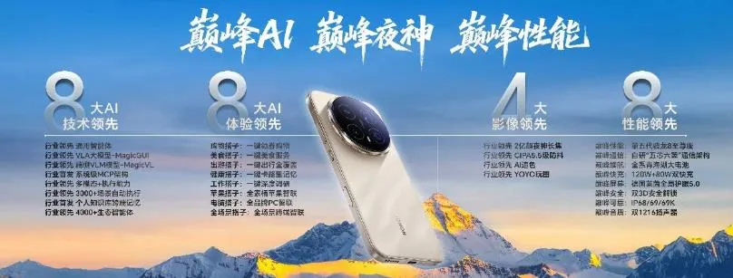 荣耀Magic8系列:搭载年度最强旗舰芯片第五代骁龙®8至尊版,CPU、GPU和AI算力大幅提升,加上荣耀深耕新一代AI与芯片底层技术的深入应用,搭载自进化AI智能体操作系统全MagicOS 10,使各个模块定制专属优化引擎,让Magic8系列在性能上更具竞争力。