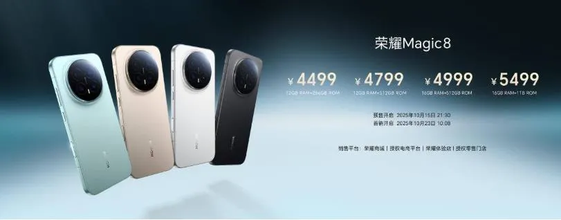荣耀Magic 8提供12GB+256GB、12GB+512GB、16GB+512GB、16GB+1TB共4个版本,售价分别为4499元、4799元、4999元、5499元。荣耀Magic 8 Pro提供12GB+256GB、12GB+512GB、16GB+512GB、16GB+1TB共4个版本,售价分别为5699元、5999元、6199元、6699元。
