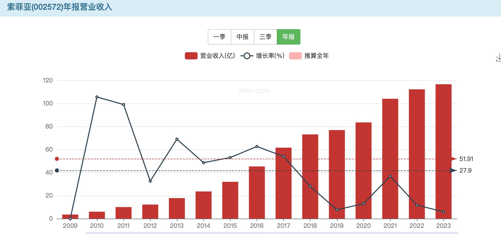 2011年,索菲亚以营收10.04亿元,利润1.35亿元的成绩打开了深交所之门,成为定制家居行业内首家A股上市的公司。