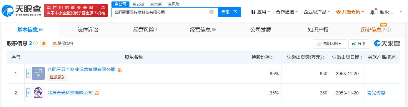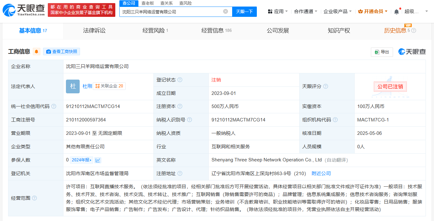该公司成立于2023年11月,法定代表人为辛文海,注册资本1000万人民币,经营范围包括演出经纪、电影发行、广播电视节目制作经营等,由合肥三只羊商业运营管理有限公司、北京奇光科技有限公司共同持股。值得注意的是,不久前,沈阳三只羊网络运营有限公司刚注销。