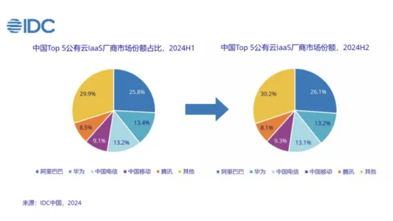 2024 下半年公有云市场中,阿里云市场份额排名第一,市占率 26.1%;华为和中国电信市占率 13.2% 与 13.1% 排名第二与第三;移动和腾讯市占率分别是 9.3% 和 8.1%,位列第四第五。百度并为登上前五名。