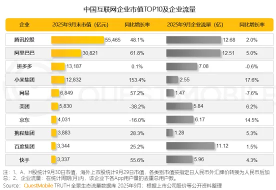 同样,根据 QuestMobile 9 月份数据显示,百度企业流量达 11.12 亿,但同比增长率只有为 1.5%,仅超过拼多多和网易,排行倒数第三。