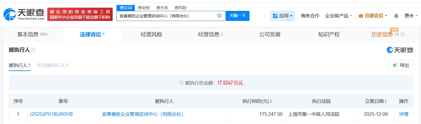 天眼查法律诉讼信息显示,近日,宜春善胜企业管理咨询中心(有限合伙)新增一则被执行人信息,执行标的17万余元,执行法院为上海市第一中级人民法院。