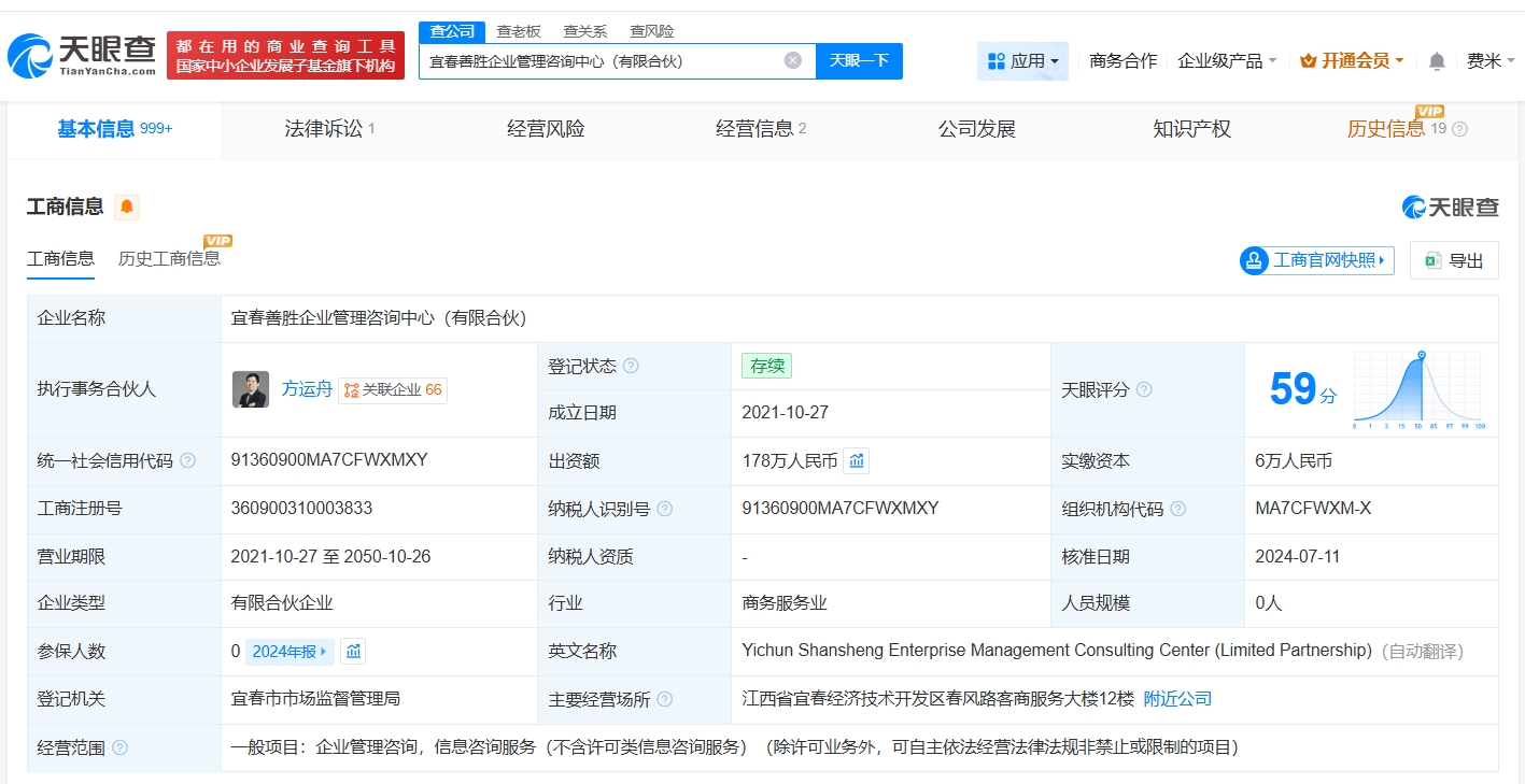 该合伙企业成立于2021年10月,执行事务合伙人为方运舟,出资额178万人民币,经营范围为企业管理咨询、信息咨询服务,由方运舟、哪吒汽车原CEO张勇、缪国栋等共同出资。