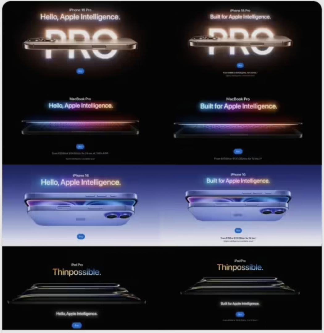 是由于其人工智能功能Apple Intelligence多次延期推出,【TechWeb】苹果悄然对iPhone 16系列产品的全球营销方案做出了调整,苹果最初在2024年的全球开发者大会(WWDC 2024)上宣布了Apple Intelligence功能。
