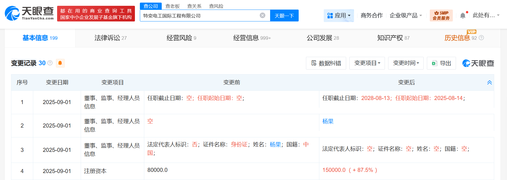 天眼查工商信息显示,近日,特变电工国际工程有限公司发生工商变更,注册资本由8亿人民币增至15亿人民币,增幅87.5%,同时,部分主要人员也发生变更。