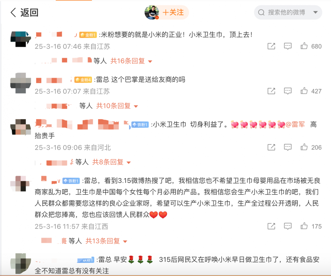 小米生态链在充电宝、空气净化器等领域的成功案例,让消费者认为其“供应链管理+质检标准”可复制到卫生巾行业。加之雷军“厚道”“理工男”人设深入人心,公众对其社会责任感有期待,也有信任。