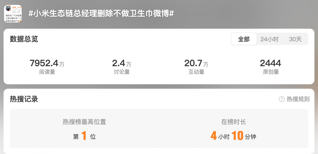 【TechWeb】3月20日消息,近日,词条“小米生态链总经理删除不做卫生巾微博”登上热搜,引发网友热议。