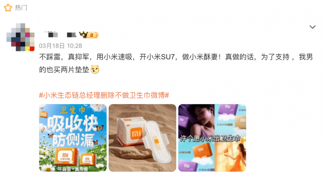 广大网友甚至已经为小米卫生巾起了一个贴切的名字——“小米SU吸Ultra”,并配上广告语:“不踩雷,真抑菌,用小米速吸,开小米SU7,做小米酥妻”。