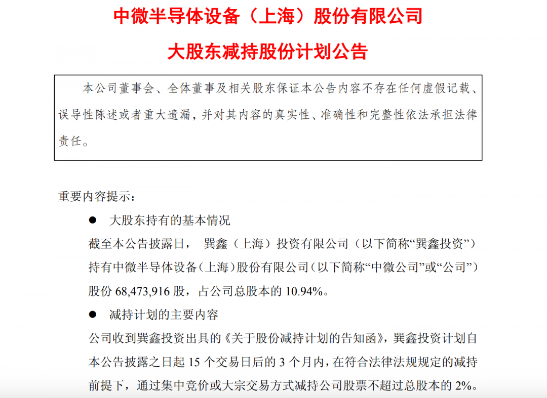 中微公司:股东及高管拟合计减持不超2.05%公司股份快讯