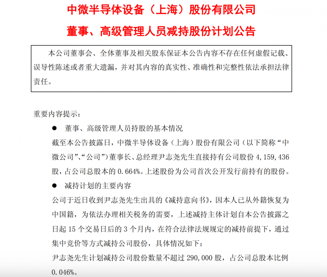 此外,中微公司董事长、总经理尹志尧因已从外籍恢复为中国籍,为依法办理相关税务需要,计划自公告披露之日起15个交易日后的3个月内,通过集中竞价方式减持公司股份不超过29万股,占公司总股本比例不超过0.046%。