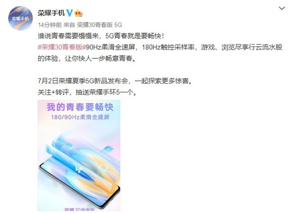 根据荣耀手机官微最新发布的消息显示,与此前曝光的消息基本一致,全新的荣耀30青春版将配备90Hz柔滑全速屏,拥有180Hz触控采样率,官方表示可以让“游戏、浏览尽享行云流水般的体验,让你快人一步畅意青春”。