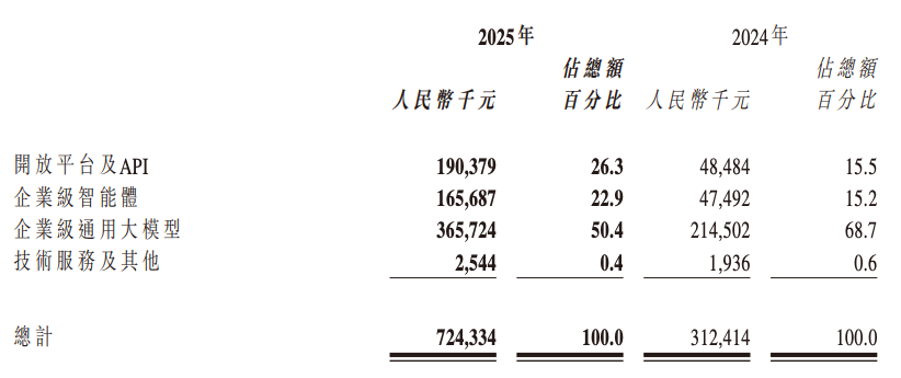 智谱收入增长主要得益于其“基座模型+平台+生态”战略的推进。按业务形态划分,开放平台及API业务收入激增292.6%至1.90亿元;企业级智能体业务收入增长248.8%至1.66亿元,成为新增长极;企业级通用大模型业务仍为收入支柱,贡献3.66亿元,占总收入50.4%。