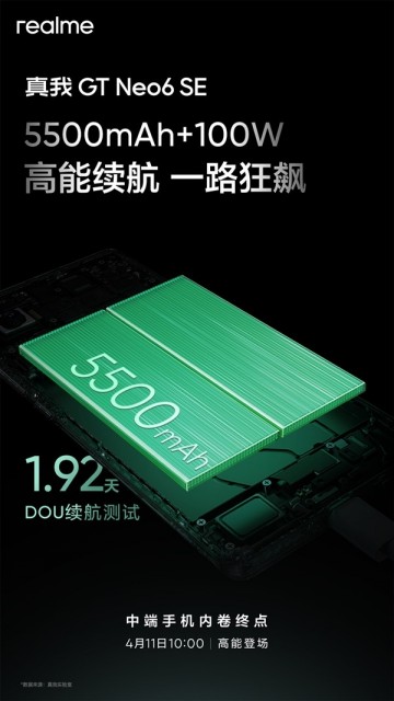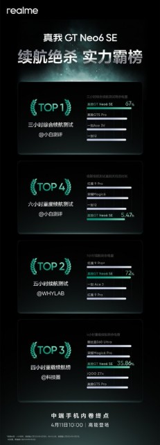 【Techweb】日前真我官方宣布,真我GT Neo6 SE的发布会时间将由原定的4月11日也就是今天下午14点提前至上午10点,随着发布会进入最后的倒计时,官方对于该机的预热也越来越密集,截至目前已经有关于该机外观和配置方面非常详尽的细节传出。而现在有最新消息,近日realme官方进一步晒出了该机的续航数据。