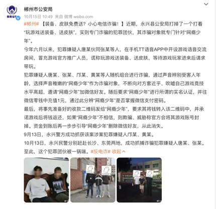 湖南郴州市永兴县公安局官微近日就发微博称,于近期打掉了一个打着“玩游戏送装备、送皮肤”,实则专门诈骗的犯罪团伙,其诈骗对象专门针对“网瘾少年”。犯罪嫌疑人在TT语音App中开设游戏语音交流房间,冒充游戏官方推广人员,谎称玩游戏送装备、送皮肤,等待游戏玩家进来后请求带玩,随后进行诈骗。