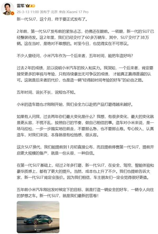面对涨价可能带来的市场压力,雷军展现出强烈的自信。他直言,作为汽车行业的“后来者”,小米必须接受市场更严苛的审视。价格调整的背后,是小米坚持“打造经得起时间考验的好车”的初衷。新一代 SU7 在安全底线、驾控乐趣、智能化深度及豪华质感四个维度的全面跃升,构成了此次价格调整的底气。