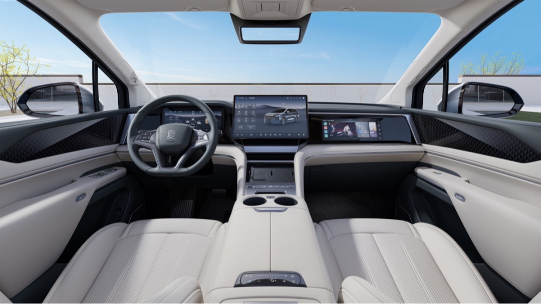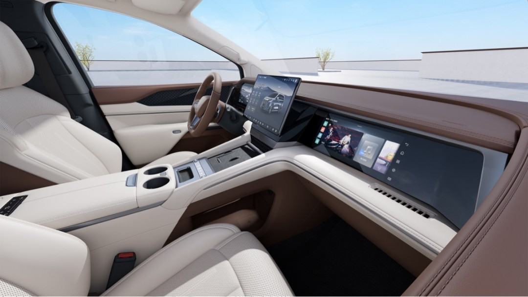 前排采用了三联屏设计,包括液晶仪表、副驾娱乐屏,以及大尺寸中控屏幕。色彩方面采用绾棕+润米、远山黛+润米两款内饰配色,营造出大气优雅的氛围感和豪华舒适的奢享感。