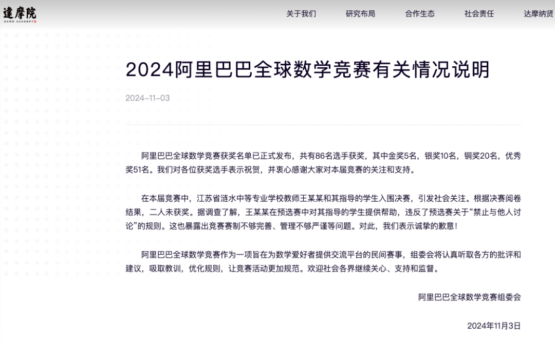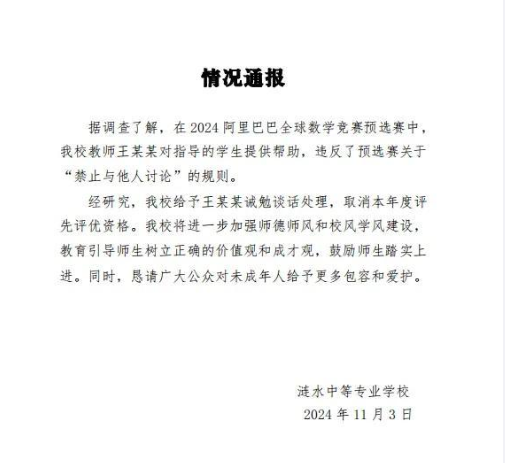 江苏省涟水中等专业学校也在3日发布情况通报:据调查了解,在2024阿里巴巴全球数学竞赛预选赛中,该校教师王某某对指导的学生提供帮助,违反了预选赛关于“禁止与他人讨论”的规则。经研究,该校给予王某某诫勉谈话处理,取消本年度评先评优资格。该校将进一步加强师德师风和校风学风建设,教育引导师生树立正确的价值观和成才观,鼓励师生踏实上进。同时,恳请广大公众对未成年人给予更多包容和爱护。