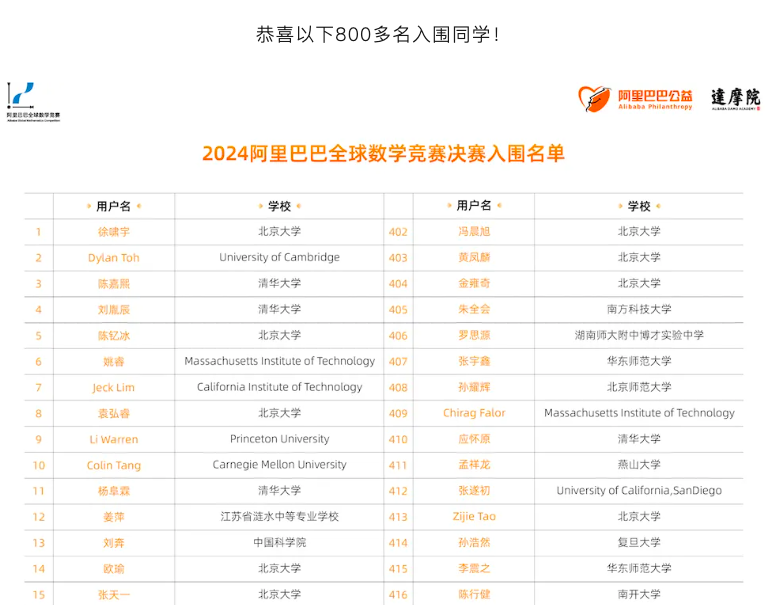 今年6月,达摩院公布了2024年阿里巴巴全球数学竞赛决赛入围名单,共有800多名同学入围。其中,姜萍排名12。