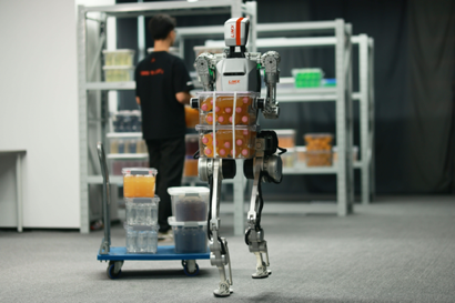 CL-1自主追踪移动中的手推车,在堆叠货物中识别指定目标——总重为8.2kg的两箱汽水。虽然和前一次搬运的货物重量差超过4kg,CL-1的全身运动依然保持动态协调,搬运过程中步态稳健,顺利完成了最后的搬运任务。