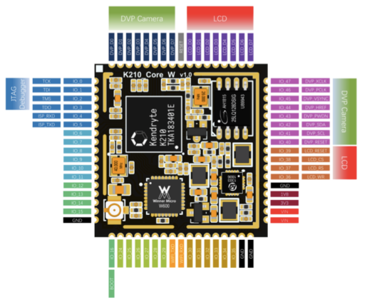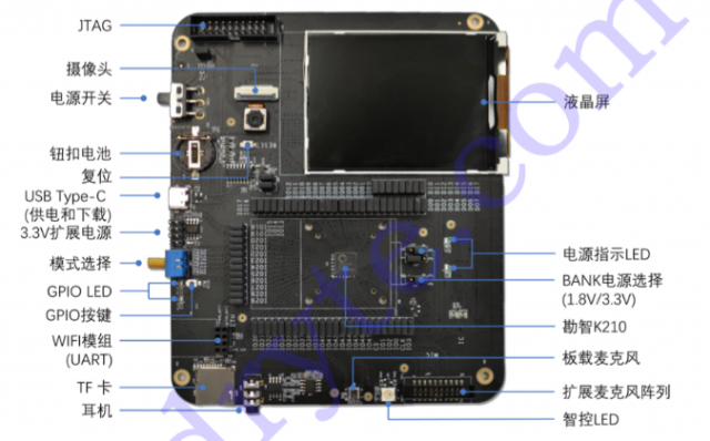 该平台的核心是嘉楠科技自主研发的勘智K210,芯片兼具低功耗和高位宽特性,支持INT8/INT16等多种计算精度,并搭载FPU高性能浮点运算处理单元。芯片内部集成专门针对图像识别、人脸识别等机器视觉任务设计的CNN网络加速器KPU,以及音频处理加速单元APU,可实现声源定向、FFT信号处理、语音唤醒等功能。