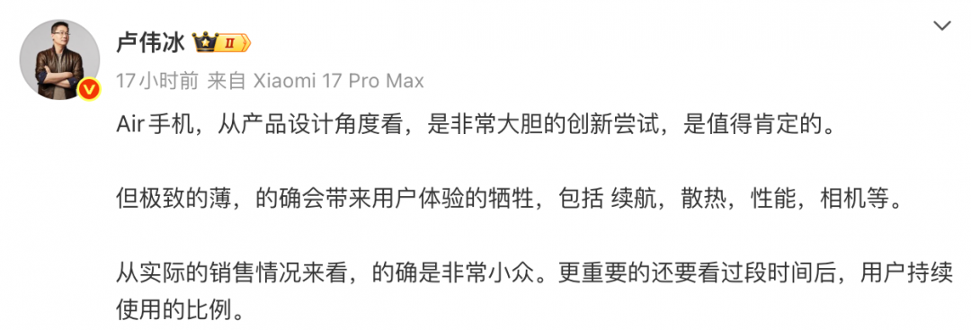 卢伟冰表示:“Air手机,从产品设计角度看,是非常大胆的创新尝试,是值得肯定的。但极致的薄,的确会带来用户体验的牺牲,包括 续航,散热,性能,相机等。从实际的销售情况来看,的确是非常小众。更重要的还要看过段时间后,用户持续使用的比例。 ”