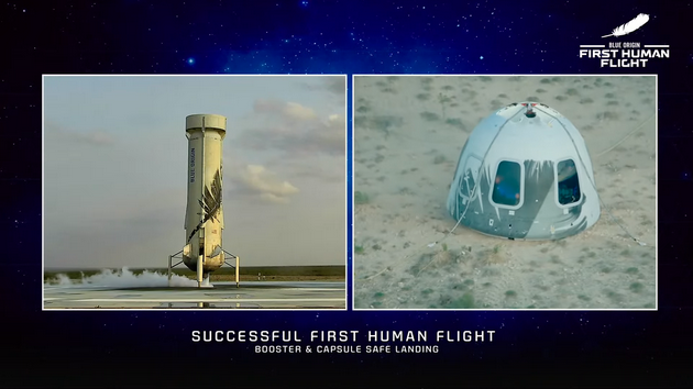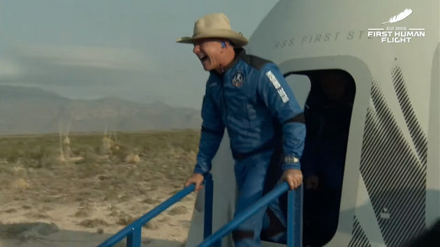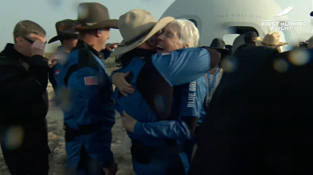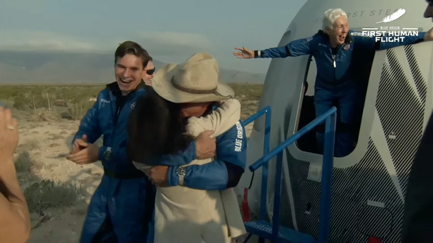 等待舱门打开时,杰夫·贝索斯对着大窗户频频竖起大拇指。21:30左右,舱门打开。杰夫·贝索斯率先走出舱门,与众人相拥。接着是奥利弗·戴门,沃利·芬克紧随其后,最后是马克·贝索斯。