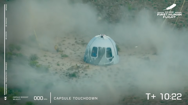 1分钟后,太空舱降落伞打开,着陆于沙漠。在那里,蓝色起源的团队已经等待四人“回家”。