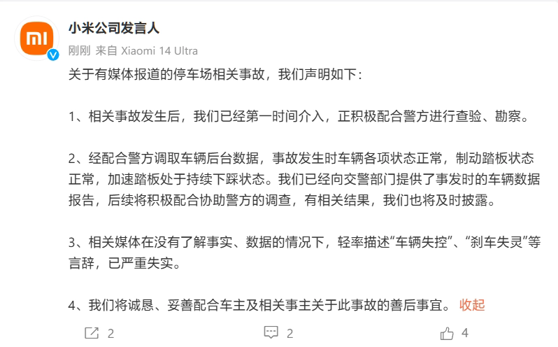 针对此事,小米公司发言人发表声明,称事发时车辆一切正常,声明如下: