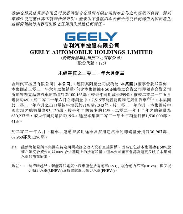 7月6日下午消息,吉利汽车在港交所公告称,6月总销量为10.02万部,同比减少约9%,环比增长约4%;上半年总销量为63.02万部,同比增长约19%,达至全年销量目标153万部的41%。