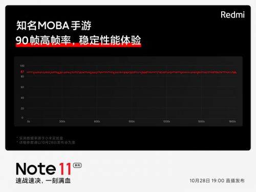一般来说,一款手机是否支持游戏高帧率,是其性能重要分水岭的表现,而Redmi Note 11系列通过了知名大型MOBA游戏高帧率模式的实测:平均帧率在87fps左右,长时间运行依然稳定。