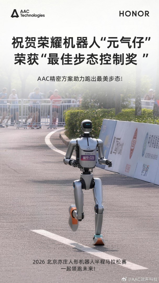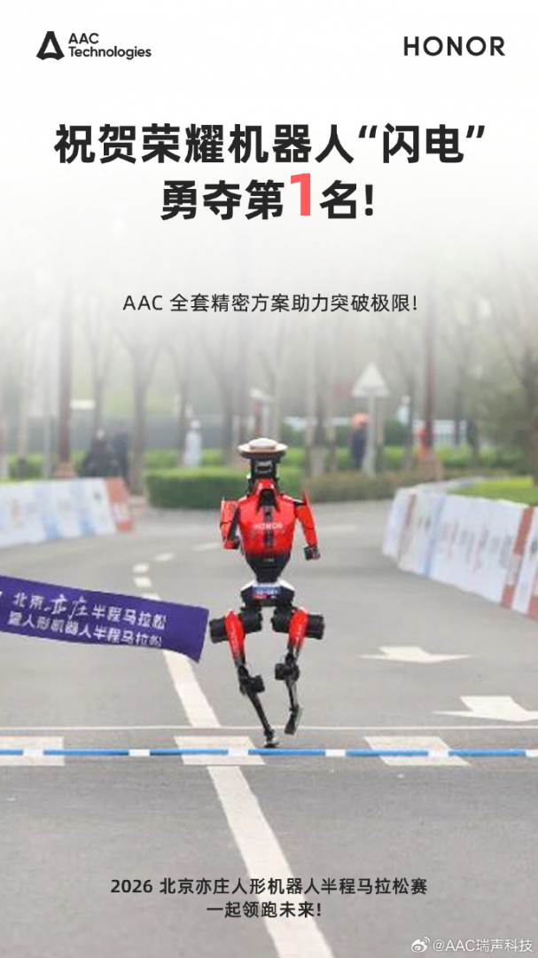 【TechWeb】4月19日上午,2026北京亦庄人形机器人半程马拉松开跑。荣耀齐天大圣队、雷霆闪电队和星火燎原队所使用的人形机器人“闪电”,分别以50分26秒、50分56秒和53分01秒的成绩包揽前三;荣耀“元气仔”则凭借自然流畅的拟人化表现获得”最佳步态控制奖“。在这一成绩背后,荣耀的首选核心供应商瑞声科技(02018.HK)提供了关键助力。