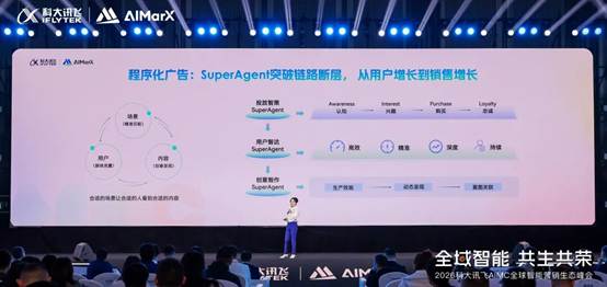 科大讯飞AI营销业务群副总裁、程序化广告业务部总经理田明磊表示,围绕“新品牌力”的打造,AIMarX基于SuperAgent构建涵盖全域流量、全域触达、全域转化的全域营销平台,并搭建起覆盖全链路的增长归因体系。