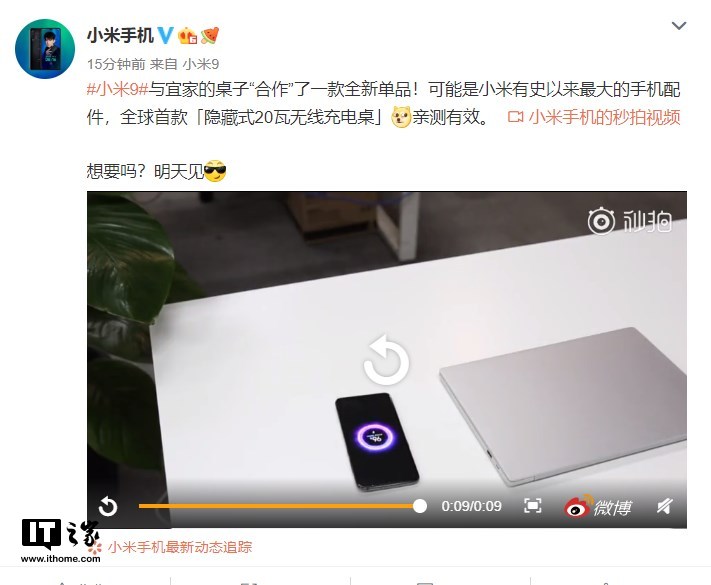 小米9与宜家合作的这款无线充电桌将在明天公布,感兴趣的小伙伴可以关注一下。
