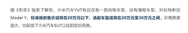 YU7的选配车型或将在20万元至30万元之间,价格跨度很大,也延续了小米汽车SU7以往的定价风格。