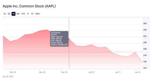 在周四下跌之后,苹果公司股价在今年的前10个交易日,就已有7个交易日下跌,周四收盘时的228.26美元,较2024年最后一个交易日250.42美元的收盘价,低了22.16美元。(海蓝)
