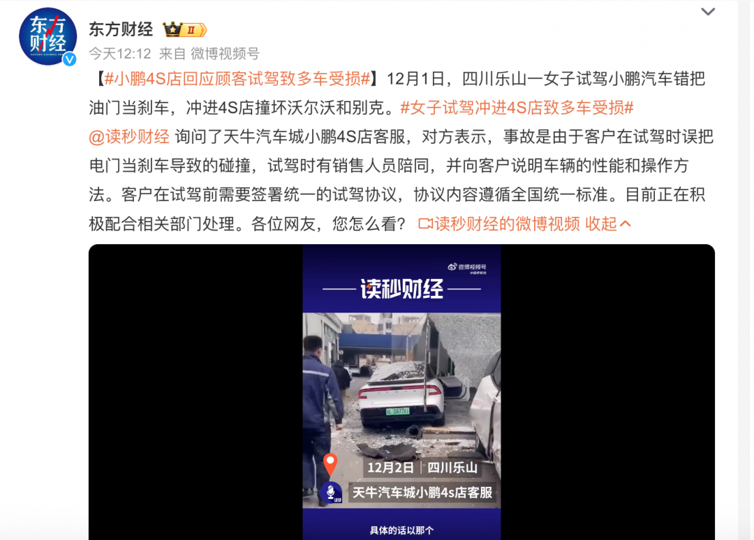 顾客试驾“误踩油门”致多车受损 小鹏4S店回应