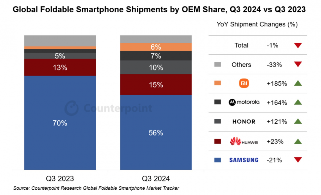根据Counterpoint Research最新的全球折叠屏智能手机市场追踪报告,在经历连续六个季度同比增长后,2024年第三季度全球折叠屏智能手机出货量同比下降1%。