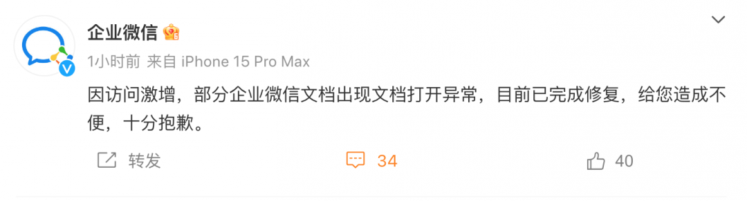 随后,企业微信文档官微发文称,“因访问激增,部分企业微信文档出现文档打开异常,目前已完成修复。”