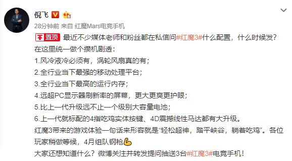3月14日,努比亚手机总经理倪飞发布长微博揭晓了红魔3电竞手机在散热方面的专利技术,红魔官方也表示红魔3将内置涡轮风扇,实现主动式散热。随后倪飞还表示,红魔3在散热功能得到强大提升的同时,机身厚度比上一代更薄,电池容量也会更大。如此劲爆的配置吸引了众多媒体和粉丝关注,都在猜测红魔3还有什么强悍配置,什么时候发布?今天倪飞在微博逐一回应了媒体老师和粉丝的疑问。