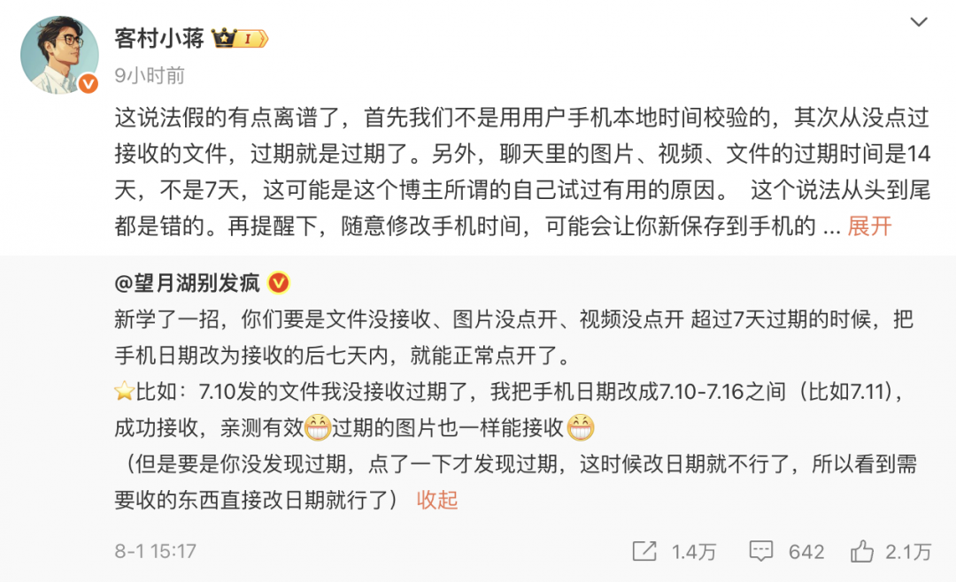 “首先我们不是用用户手机本地时间校验的,其次从没点过接收的文件,过期就是过期了。另外,聊天里的图片、视频、文件的过期时间是14天,不是7天,这可能是这个博主所谓的自己试过有用的原因。”他还提醒,随意修改手机时间,可能会让新保存到手机的图片、文件的排序发生混乱,这个操作也非常不建议尝试。