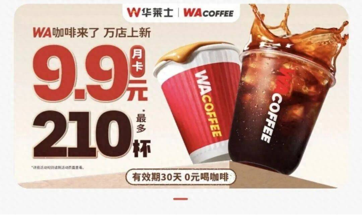 但有意思的是,一边是头部玩家理性回调,另一边却仍有新玩家在疯狂“撒币”。 近日,华莱士旗下“WA咖啡”推出9.9元月卡,宣称每月最多可领210杯咖啡,单杯成本不足5分钱;