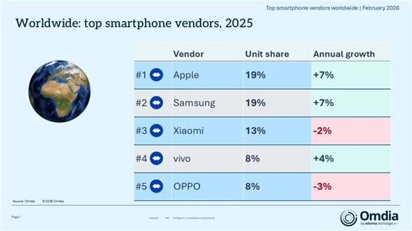 从区域维度来看,全球主要智能手机市场在2025年均实现了出货量的同比增长,唯独大中华区例外。报告分析指出,中国大陆市场出货量出现小幅下滑,主要原因在于补贴政策的激励效果未达预期。这种“外热内冷”的市场态势,也直接影响了不同品牌的市场排位。