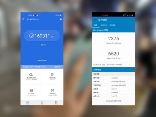 从测试结果来看,Galaxy A60元气版的安兔兔跑分得分169311,Geekbench4单核成绩2376,多核6520,所有跑分数据都属于目前同价位的智能手机中的顶尖水平,让千元机也能实现畅快体验。