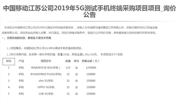 据C114报道,今日,江苏移动发布2019年5G测试手机集采询价公告,共采购5款手机,分别为华为MATE 20 X(5G手机)、中兴AXON10 Pro(5G手机)、vivo 5G手机、OPPO 5G手机、小米5G手机。