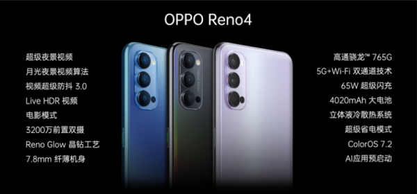 OPPO Reno4系列继续瞄准5G视频手机赛道,以更强的视频能力锚定市场。包括超级夜景视频、视频超级防抖3.0在内的独创性影像功能,不仅彰显OPPO在视频赛道上的深耕细作,也体现了OPPO对用户体验的细微洞察。从卡位,到布局,到持续拓展,不断的创新使OPPO在5G视频手机赛道上始终立于领先地位。而65W超级闪充、超级夜景视频以及Reno Glow晶钻工艺等,则体现OPPO在技术创新方面的持续领先。