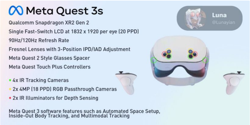 8 月 13 日消息,消息源 @Lunayian 昨日在 X 平台曝料,分享了 Meta Quest 3S 头显的更多细节。