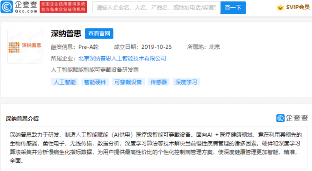 企查查信息显示,深纳普思致力于研发、制造人工智能赋能(AI供电)医疗级智能可穿戴设备,公司成立于2019年,法定代表人为王智华,经营范围包含:仪器仪表、计算机、软件及辅助设备;医学研究与试验发展等。