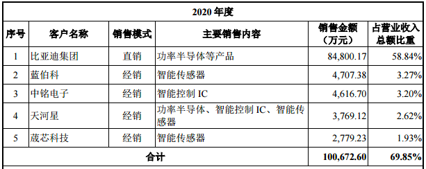 从比亚迪半导体披露的2018年至2020年前五大客户名单中来看,比亚迪集团一直稳居第一大客户之位,贡献的营收占比超过50%。