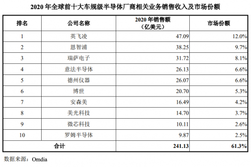 【TechWeb】7月2日消息,今年以来全球车规级半导体产能紧张,致使多家大牌车企不得不暂停产线停工减产,业界对半导体的关注和热情也空前高涨起来。不过,根据 Omdia 统计,2020 年全球前十大车规级半导体厂商中都没有国内企业的踪影。